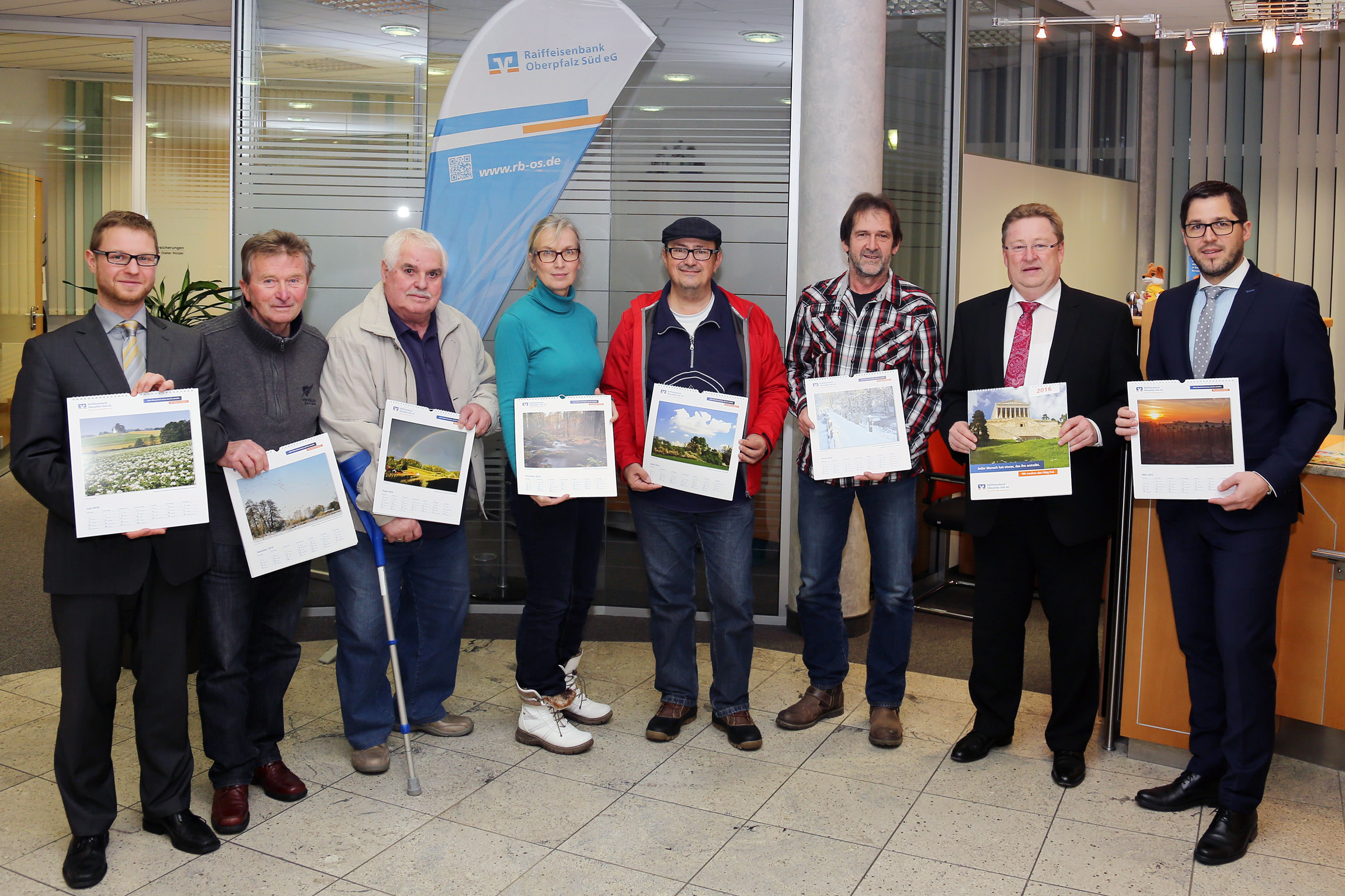 Schierling (rb) Am vergangenen Montag, stellte der Vorstandsvorsitzende der Raiffeisenbank Oberpfalz Süd eG, Johann Pernpaintner zusammen mit Andreas Huber und Holger Bursian den druckfrischen Wandkalender der Bank für das Jahr 2016 vor. Bei der Präsentation anwesend waren auch die Mitglieder des Photoclubs Schierling, Robert Beck (Vorsitzender), Petra Härtl, Georg Hierl, Hans Merl und Hans Härtl.
